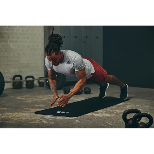 Adidas 10 mm Træningsmåtte er en komfortabel og stabil træningsmåtte, udviklet til effektiv gulvtræning med fokus på støtte, greb og holdbarhed. Den sorte og blå farve giver et klassisk og roligt udtryk, som passer perfekt til både hjemmetræning og fitnesscenter.