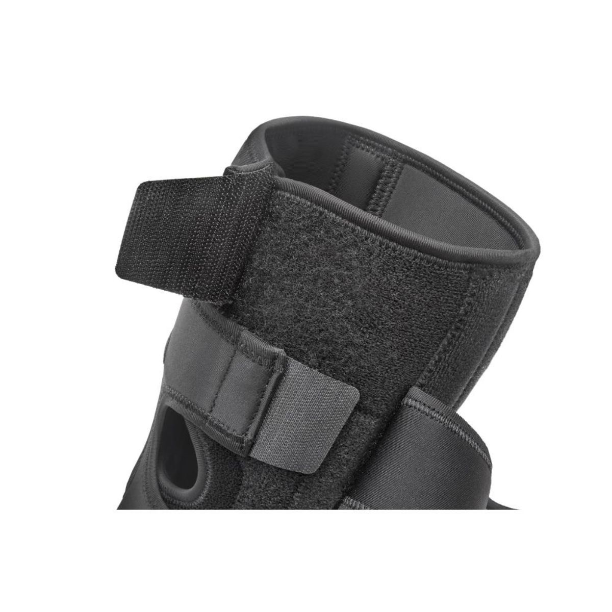 Den ergonomiske konstruktion er udstyret med integrerede fishbone-stivere langs begge sider af knæleddet, som bidrager til øget stabilitet og kontrolleret bevægelse. Det elastiske neoprenmateriale sikrer optimal kompression uden at begrænse knæets naturlige bevægelsesfrihed, så du kan bevæge dig frit og sikkert.