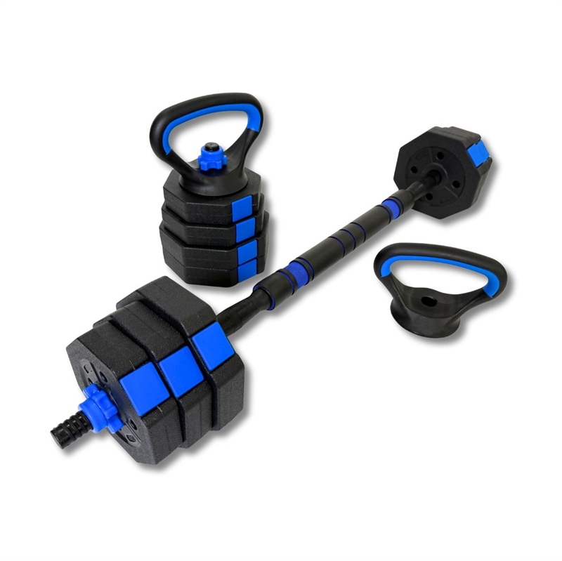 ✔ 3-i-1 løsning: vægtstang, håndvægte og kettlebell