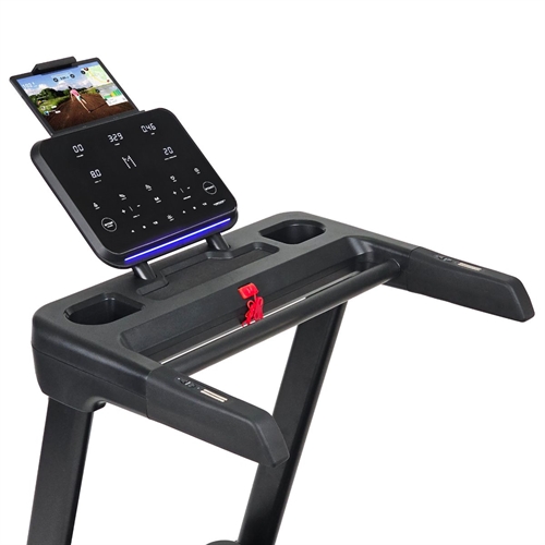 Det store display viser tid, distance, hastighed, kalorier, hældning, puls og BMI – med praktisk hylde til tablet eller smartphone.