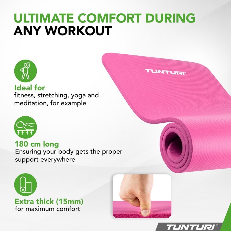 Få mere ud af din træning med Tunturi NBR Yogamåtte – den perfekte måtte til alt fra yoga og pilates til styrkeøvelser og stræk. Med sin generøse længde på 180 cm og en tykkelse på 15 mm får du både komfort, stabilitet og støtte, så du kan fokusere fuldt ud på din træning.